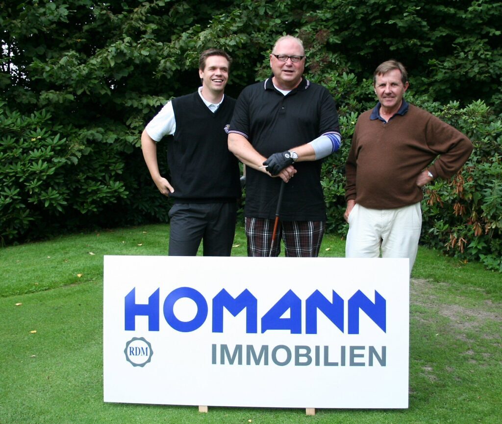 Nach dem Hitzefest im vergangenen Jahr folgte jetzt der „Tusch von oben“: Beim beliebten Homann Immobilien Cup am 18. August auf dem Golfplatz Wilkinghege wurden die Teilnehmer leider das eine oder andere Mal sprichwörtlich von der Sonne im Regen stehen gelassen. Doch selbst eine 15-minütige Unterbrechung tat der guten Stimmung keinen Abbruch, schließlich freuten sich die rund 50 Teilnehmer schon das ganze Jahr über auf dieses Turnier – ebenso wie Ausrichter Bernard Homann, Geschäftsführender Gesellschafter der Homann Immobiliengruppe und begeisterter Golfer bei den AMiGoHs. Bruttosieger und Gewinner des Homann Pokals Rainer Wallraff bestätigte ebenso wie die Veranstalter die Beliebtheit des Turniers: „Der Homann Immobilien Cup ist definitiv das Highlight der Turnierserie der AMiGoHs.“ Sieger Netto Klasse A wurde Ulf Bischof, Sieger Netto Klasse B Jost Benning und Sieger Netto Klasse C Elmar Grimm. Zu den vielen tollen Gewinnen zählten u. a. exklusive Champagnerflaschen. Alle Teilnehmer bekamen zudem einen Homannball als Tee-Geschenk. Auch für das leibliche Wohl war gesorgt: Nach Kaffee und Kuchen in der Half-Way Hütte nach Bahn 10 gab es nach dem Spiel noch köstlichen bayrischen Kartoffelsalat und kleine Nürnberger Würstchen. „Insgesamt war das Turnier trotz Regen ein voller Erfolg“, so Bernard Homann zufrieden.